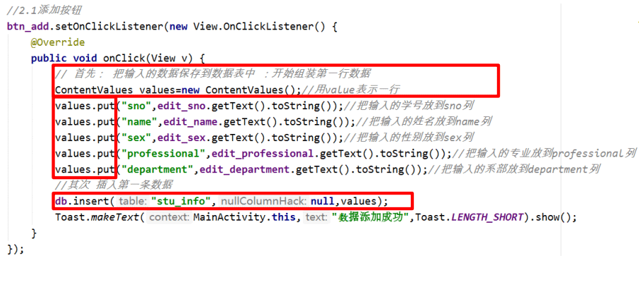 public class MainActivity extends AppCompatActivity { //定义对象 private EditText edit_onesno,edit_onename,edit_onesex,edit_onepro,edit_onedep; private Button btn_oneadd,btn_oneclear,btn_onenext; private MyDBOpenHelper mhelper;//定义数据库帮助类对象 private SQLiteDatabase db;//定义一个可以操作的数据库对象 @Override protected void onCreate(Bundle savedInstanceState) { super.onCreate(savedInstanceState); setContentView(R.layout.activity_main); //1 绑定控件 initView(); //2 添加按钮功能的实现 btnAdd(); //3 清除和下一页按钮的功能 btnClearNext(); } //绑定控件-------------代码 private void initView() { edit_onesno=findViewById(R.id.editText_onesno); edit_onename=findViewById(R.id.editText_onename); edit_onesex=findViewById(R.id.editText_onesex); edit_onepro=findViewById(R.id.editText_onepro); edit_onedep=findViewById(R.id.editText_onedep); btn_oneadd=findViewById(R.id.button_oneadd); btn_oneclear=findViewById(R.id.button_oneclear); btn_onenext=findViewById(R.id.button_onenext); mhelper=new MyDBOpenHelper(MainActivity.this);//实例化数据库帮助类 db=mhelper.getWritableDatabase();//创建数据库,获取数据库的读写权限 } //2 添加按钮功能的实现------代码 private void btnAdd() { btn_oneadd.setOnClickListener(new View.OnClickListener() { @Override public void onClick(View v) { //定义一个对象,构建一行数据 ContentValues values=new ContentValues();//用 value 表示一行 values.put("sno",edit_onesno.getText().toString());//把输入的学号放到 sno 列 values.put("name",edit_onename.getText().toString());//把输入的姓名放到 name 列 values.put("sex",edit_onesex.getText().toString());//把输入的性别放到 sex 列 values.put("professional",edit_onepro.getText().toString());//把输入的专业放到 professional 列 values.put("deparment",edit_onedep.getText().toString());//把输入的系部放到 department 列 //将这一行数据存放到数据库的数据表中。参数:(表名,某些为空的列自动赋值 null,ContentValue 对象) db.insert("stu_info",null,values); Toast.makeText(MainActivity.this,"添加成功",Toast.LENGTH_SHORT).show(); } }); } //3 清除和下一页按钮的功能-----代码 private void btnClearNext() { //清除按钮的功能 btn_oneclear.setOnClickListener(new View.OnClickListener() { @Override public void onClick(View v) { edit_onesno.setText(""); edit_onename.setText(""); edit_onesex.setText(""); edit_onepro.setText(""); edit_onedep.setText(""); } }); //下一页按钮的功能 btn_onenext.setOnClickListener(new View.OnClickListener() { @Override public void onClick(View v) { Intent intent=new Intent(MainActivity.this,SecondActivity.class); startActivity(intent); finish(); } }); } }