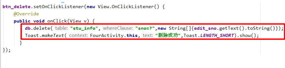public class FourActivity extends AppCompatActivity { //定义对象 EditText edit_foursno; Button btn_fourdelete; MyDBOpenHelper mhelper;//定义一个数据库帮助类对象 SQLiteDatabase db;//定义一个操作的数据库的类对象 @Override protected void onCreate(Bundle savedInstanceState) { super.onCreate(savedInstanceState); setContentView(R.layout.activity_four); //1 控件初始化 initView(); //2 删除按钮功能的实现 btnDelete(); } //1 控件初始化----------代码 private void initView() { edit_foursno=findViewById(R.id.editText_foursno); btn_fourdelete=findViewById(R.id.button_fourdelete); mhelper=new MyDBOpenHelper(FourActivity.this);//实例化数据库帮助类对象 db=mhelper.getWritableDatabase();//获取数据库的读写权限 } //2 删除按钮功能的实现-----代码 private void btnDelete() { btn_fourdelete.setOnClickListener(new View.OnClickListener() { @Override public void onClick(View v) { //怎么样删除呢?参数:(表名,删除的条件,条件的参数) db.delete("stu_info","sno=?",new String[]{edit_foursno.getText().toString()}); Toast.makeText(FourActivity.this,"删除成功",Toast.LENGTH_SHORT).show(); } }); } }