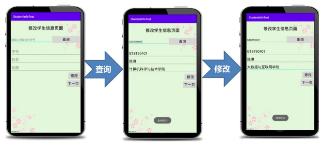 public class ThirdActivity extends AppCompatActivity { //定义对象 EditText edit_threeinputsno,edit_threesno,edit_threename,edit_threedep; Button btn_threequery,btn_threemodify,btn_threenext; MyDBOpenHelper mhelper;//定义一个数据库帮助类对象 SQLiteDatabase db;//定义一个操作的数据库的类对象 @Override protected void onCreate(Bundle savedInstanceState) { super.onCreate(savedInstanceState); setContentView(R.layout.activity_third); //1 控件初始化 initView(); //2 查询按钮功能的实现 btnQuery(); //3 修改按钮功能的实现 btnModify(); //4 下一步按钮功能的实现 btnNext(); } //1 控件初始化-------------代码 private void initView() { edit_threeinputsno=findViewById(R.id.editText_threeinputsno); edit_threesno=findViewById(R.id.editText_threesno); edit_threename=findViewById(R.id.editText_threename); edit_threedep=findViewById(R.id.editText_threedep); btn_threequery=findViewById(R.id.button_threequery); btn_threemodify=findViewById(R.id.button_threemodify); btn_threenext=findViewById(R.id.button_threenext); mhelper=new MyDBOpenHelper(ThirdActivity.this);//实例化数据库帮助类对象 db= mhelper.getWritableDatabase();//获取数据库的读写权限 } //2 查询按钮功能的实现 private void btnQuery() { btn_threequery.setOnClickListener(new View.OnClickListener() { @Override public void onClick(View v) { //先查询显示,再修改。参数(String sql,String[ ] selectionArgs) Cursor cursor=db.rawQuery("select * from stu_info where sno=?",new String[]{edit_threeinputsno.getText().toString()}); if(cursor.getCount()!=0){ Toast.makeText(ThirdActivity.this,"查询成功",Toast.LENGTH_SHORT).show(); while(cursor.moveToNext()){ String mysno=cursor.getString(cursor.getColumnIndex("sno")); String myname=cursor.getString(cursor.getColumnIndex("name")); String mydep=cursor.getString(cursor.getColumnIndex("deparment")); edit_threesno.setText(mysno); edit_threename.setText(myname); edit_threedep.setText(mydep); } }else{ Toast.makeText(ThirdActivity.this,"没有查询到该学号的学生",Toast.LENGTH_SHORT).show(); edit_threesno.setText(""); edit_threename.setText(""); edit_threedep.setText(""); } } }); } //3 修改按钮功能的实现---------代码 private void btnModify() { btn_threemodify.setOnClickListener(new View.OnClickListener() { @Override public void onClick(View v) { //修改数据代码如何写呢?参数:(表名,ContentValues 对象,更新的条件,条件的参数) ContentValues values=new ContentValues(); values.put("deparment",edit_threedep.getText().toString()); db.update("stu_info",values,"sno=?",new String[]{edit_threesno.getText().toString()}); Toast.makeText(ThirdActivity.this,"修改成功",Toast.LENGTH_SHORT).show(); } }); } //4 下一页按钮功能的实现------代码 private void btnNext() { btn_threenext.setOnClickListener(new View.OnClickListener() { @Override public void onClick(View v) { Intent intent=new Intent(ThirdActivity.this,FourActivity.class); startActivity(intent); finish(); } }); } }