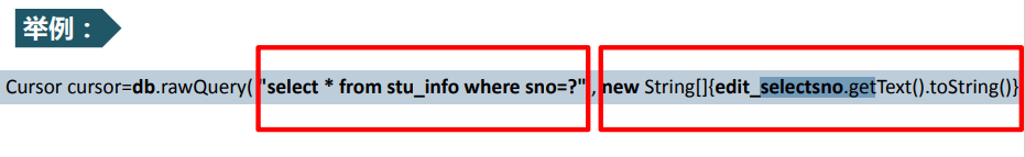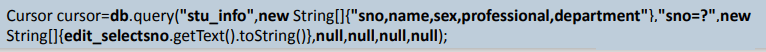 selectionArgs:是?条件参数,如果?这个内占位符容为null的话就表示把所有的学号的学生都查出来
