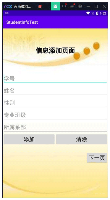 <?xml version="1.0" encoding="utf-8"?> <LinearLayout xmlns:android="http://schemas.android.com/apk/res/android" xmlns:app="http://schemas.android.com/apk/res-auto" xmlns:tools="http://schemas.android.com/tools" android:layout_width="match_parent" android:layout_height="match_parent" android:orientation="vertical" android:background="@drawable/addbg" tools:context=".MainActivity"> <TextView android:layout_width="wrap_content" android:layout_height="wrap_content" android:text="信息添加页面" android:textSize="30sp" android:textStyle="bold" android:textColor="#000000" android:layout_gravity="center" android:layout_margin="80dp"/> <EditText android:id="@ id/editText_onesno" android:layout_width="match_parent" android:layout_height="wrap_content" android:hint="学号" android:textSize="25sp"/> <EditText android:id="@ id/editText_onename" android:layout_width="match_parent" android:layout_height="wrap_content" android:hint="姓名" android:textSize="25sp"/> <EditText android:id="@ id/editText_onesex" android:layout_width="match_parent" android:layout_height="wrap_content" android:hint="性别" android:textSize="25sp"/> <EditText android:id="@ id/editText_onepro" android:layout_width="match_parent" android:layout_height="wrap_content" android:hint="专业班级" android:textSize="25sp"/> <EditText android:id="@ id/editText_onedep" android:layout_width="match_parent" android:layout_height="wrap_content" android:hint="所属系部" android:textSize="25sp"/> <LinearLayout android:layout_width="match_parent" android:layout_height="wrap_content" android:orientation="horizontal"> <Button android:id="@ id/button_oneadd" android:layout_width="wrap_content" android:layout_height="wrap_content" android:text="添加" android:textSize="25sp" android:layout_weight="1"/> <Button android:id="@ id/button_oneclear" android:layout_width="wrap_content" android:layout_height="wrap_content" android:text="清除" android:textSize="25sp" android:layout_weight="1"/> </LinearLayout> <Button android:id="@ id/button_onenext" android:layout_width="wrap_content" android:layout_height="wrap_content" android:text="下一页" android:textSize="25sp" android:layout_gravity="right" android:layout_marginTop="30dp"/> </LinearLayout>