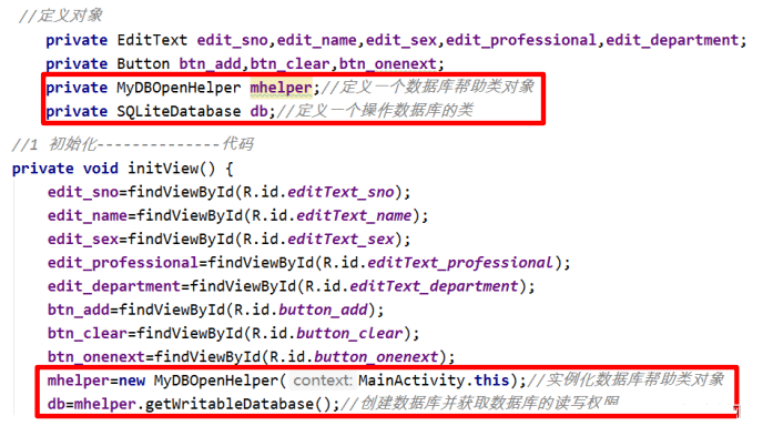 getWritableDatabase() | 以读写方式 打开数据库 | db=mhelper.getWritableDatabase(); |