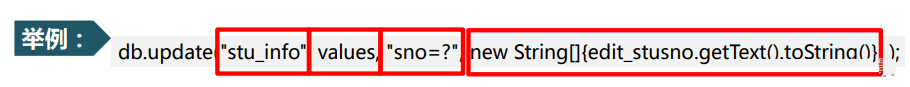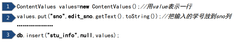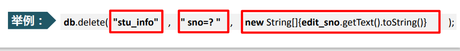 db.execSQL( ……………… ) | 创建数据表 | db.execSQL(“create table stu_info (id INTEGER primary key autoincrement,sno varchar(10),..." ); |