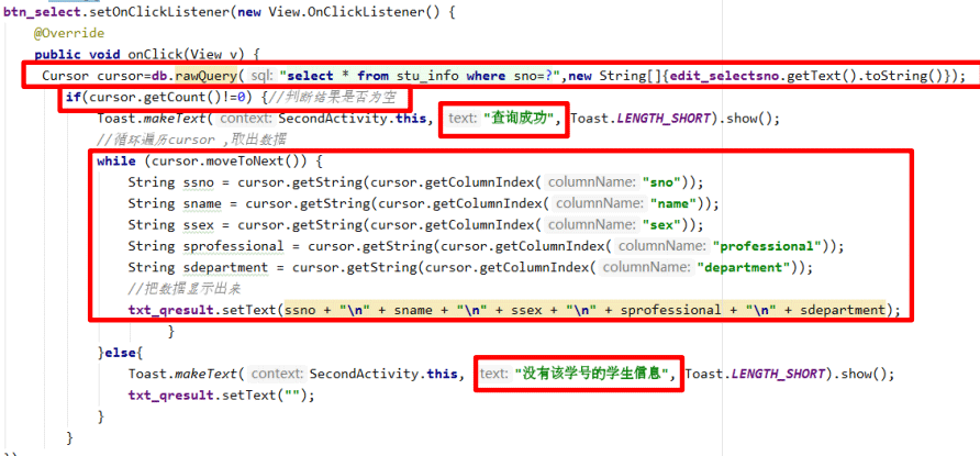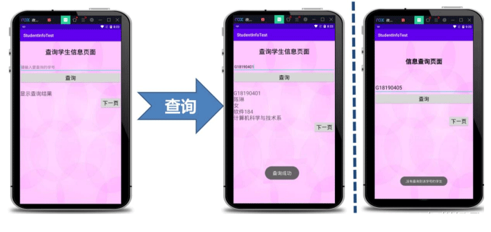 public class SecondActivity extends AppCompatActivity { //定义对象 EditText edit_twosno; Button btn_twoquery,btn_twonext; TextView txt_tworesult; MyDBOpenHelper mhelper;//定义一个数据库帮助类对象 SQLiteDatabase db;//定义一个操作的数据库的类对象 @Override protected void onCreate(Bundle savedInstanceState) { super.onCreate(savedInstanceState); setContentView(R.layout.activity_second); //1 控件初始化 initView(); //2 查询按钮功能的实现 btnQuery(); //3 下一页按钮功能的实现 btnNext(); } //1 控件初始化-----------------------代码 private void initView() { edit_twosno=findViewById(R.id.editText_twosno); btn_twoquery=findViewById(R.id.button_twoquery); txt_tworesult=findViewById(R.id.textView_tworesult); btn_twonext=findViewById(R.id.button_twonext); mhelper=new MyDBOpenHelper(SecondActivity.this);//实例化数据库帮助类对象 db=mhelper.getWritableDatabase();//获取数据库的读写权限 } //2 查询按钮功能的实现--------代码 private void btnQuery() { btn_twoquery.setOnClickListener(new View.OnClickListener() { @Override public void onClick(View v) { //开始查询 参数:(实现查询的 sql 语句,条件参数) Cursor cursor =db.rawQuery("select * from stu_info where sno=?",new String[]{edit_twosno.getText().toString()}); if(cursor.getCount()!=0){//判断结果集中是否有数据,有:查询成功;无:查询失败 Toast.makeText(SecondActivity.this,"查询成功",Toast.LENGTH_SHORT).show(); //循环遍历结果集,取出数据,显示出来 while (cursor.moveToNext()){ String mysno=cursor.getString(cursor.getColumnIndex("sno")); String myname=cursor.getString(cursor.getColumnIndex("name")); String mysex=cursor.getString(cursor.getColumnIndex("sex")); String mypro=cursor.getString(cursor.getColumnIndex("professional")); String mydep=cursor.getString(cursor.getColumnIndex("deparment")); txt_tworesult.setText(mysno "\n" myname "\n" mysex "\n" mypro "\n" mydep); } }else{ Toast.makeText(SecondActivity.this,"没有查询到该学号的学生",Toast.LENGTH_SHORT).show(); txt_tworesult.setText(""); } } }); } //3 下一页按钮功能的实现------代码 private void btnNext() { btn_twonext.setOnClickListener(new View.OnClickListener() { @Override public void onClick(View v) { Intent intent=new Intent(SecondActivity.this,ThirdActivity.class); startActivity(intent); finish(); } }); } }