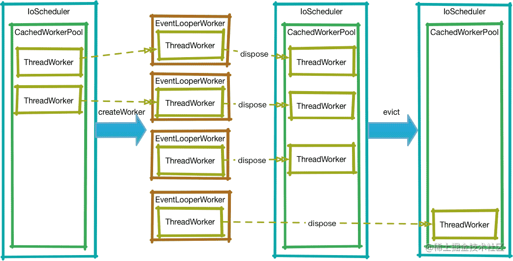 ThreadWorker,最后在外面包一层EventLoopWorker```并返回。 - 回收:当