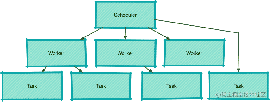 一个 Scheduler 可以创建多个 Worker,这两者是一对多的关系,而 Worker 与 Task 也是一对多的关系。