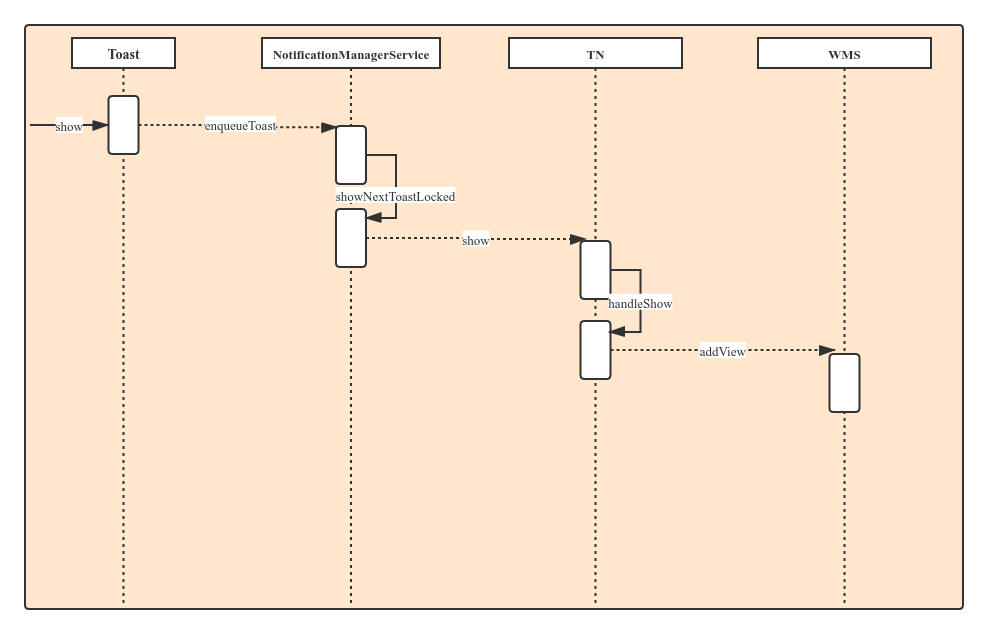 //frameworks/base/core/java/android/widget/Toast.java public void show(IBinder windowToken) { if (localLOGV) Log.v(TAG, "SHOW: " this); mHandler.obtainMessage(SHOW, windowToken).sendToTarget(); } //贴出部分handleMessage方法 case SHOW: { IBinder token = (IBinder) msg.obj; handleShow(token); break; } public void handleShow(IBinder windowToken) { ... if (mView != mNextView) { // remove the old view if necessary handleHide(); mView = mNextView; ... mWM = (WindowManager)context.getSystemService(Context.WINDOW_SERVICE); ... try { mWM.addView(mView, mParams); //交给WMS进行下一步的操作,最终显示出我们的view trySendAccessibilityEvent(); } catch (WindowManager.BadTokenException e) { /* ignore */ } } }