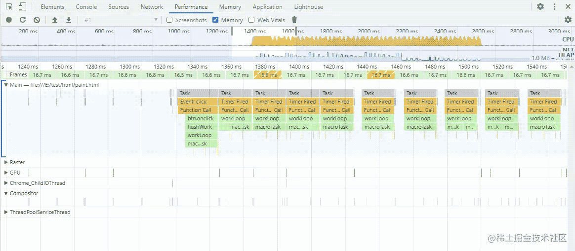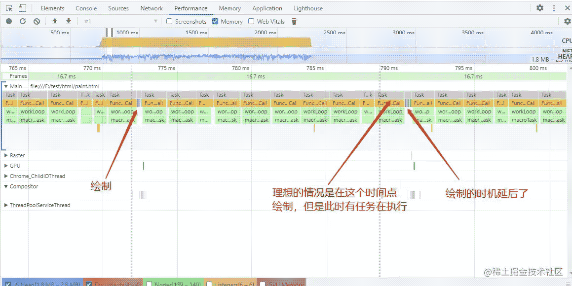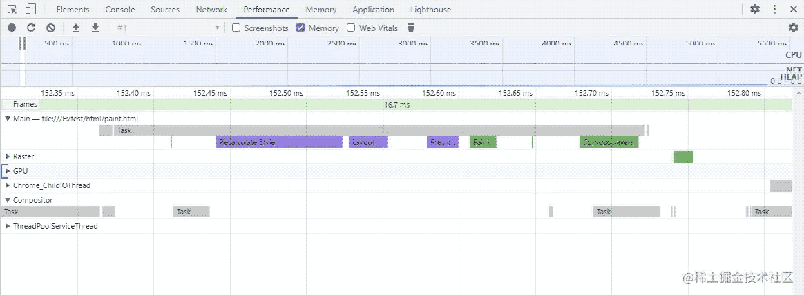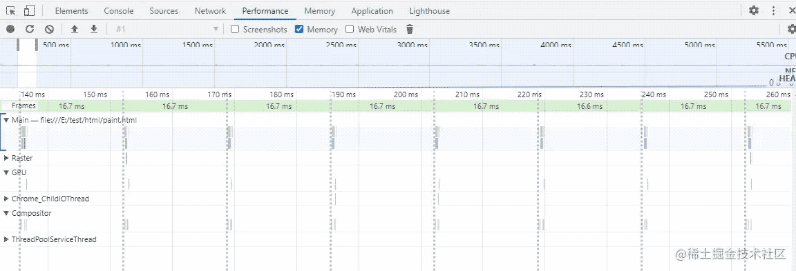 完成一次绘制需要执行Schedule Style Recalculation, Recalculate Style, Layout, Pre-Paint, Paint, Composite Layers。这里我们不细究在每个阶段浏览器做了什么,只需要关注这个渲染是在主线程上进行,由CPU完成的就行了。通常每16.7ms浏览器会绘制一次,但是如果本轮事件循环有任务在执行,那么需要等任务执行完再进行绘制。如果任务耗时过长,绘制次数就会变少,也就是所谓“掉帧”。因为我们现在页面非常简单,没有js任务,所以浏览器每16.7ms绘制一次,动画看起来很流畅。
