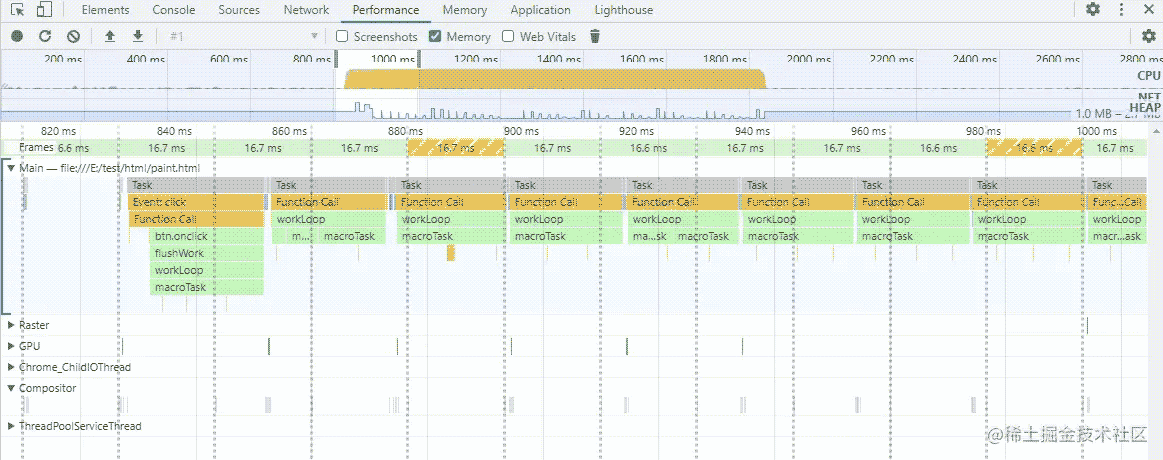 目前我们的最小任务单元的执行时间是20ms。因为超过了16.7ms会导致页面变卡顿,所以实际上我们应该确保单个任务不能超过16.7ms。假设经过合理的设计,我们的最小任务单元执行时间不会超过2ms(这里随机设置成1ms或2ms)。然后再来看看点击按钮后执行1000个任务会怎么样。
