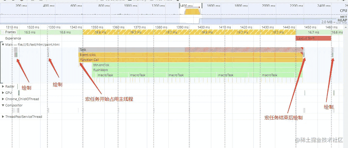 点击按钮会发现,正在滑动的div卡顿了一下,通过下图可以看到,浏览器直到5个宏任务完成后才会执行渲染,在这段时间里面,页面不能更新,也不能响应用户操作。