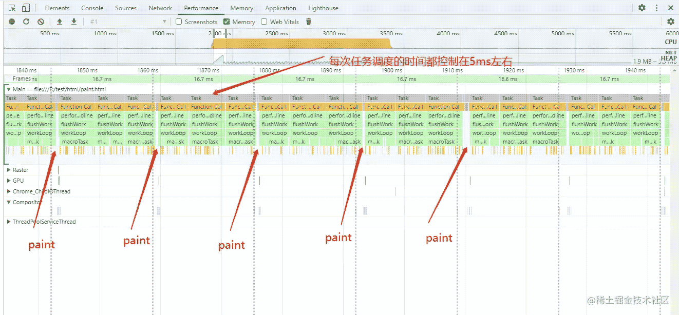 分析运行结果,可以看到现在浏览器绘制的帧率还是没有60fps,我们的任务占据主线程时间太长了。所以我们需要一种机制,使得在一帧的时间内尽可能执行多个任务,而且留有充足的时间给浏览器绘制页面和响应用户交互。