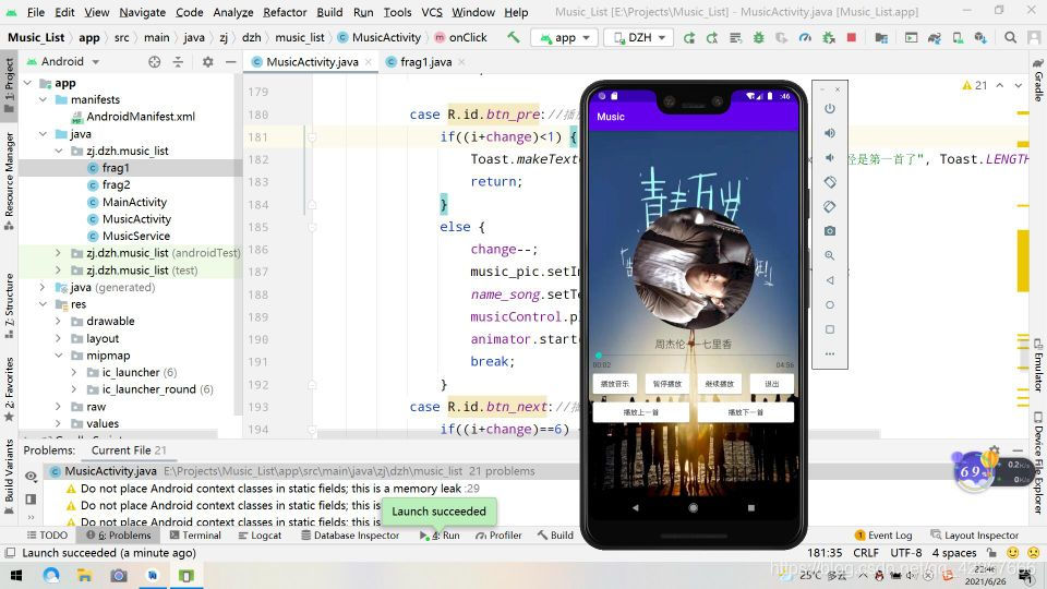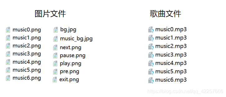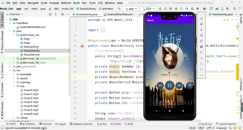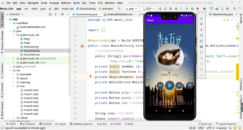 我在res文件夹下创建了raw文件夹,用来放音乐文件,音乐文件的命名注意是从music0开始,很多同学从music1开始命名导致获取不到第一首音乐然后闪退。