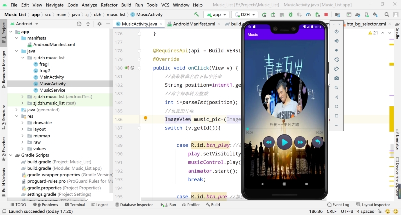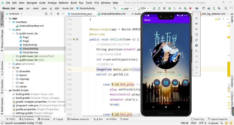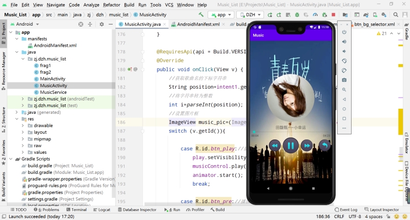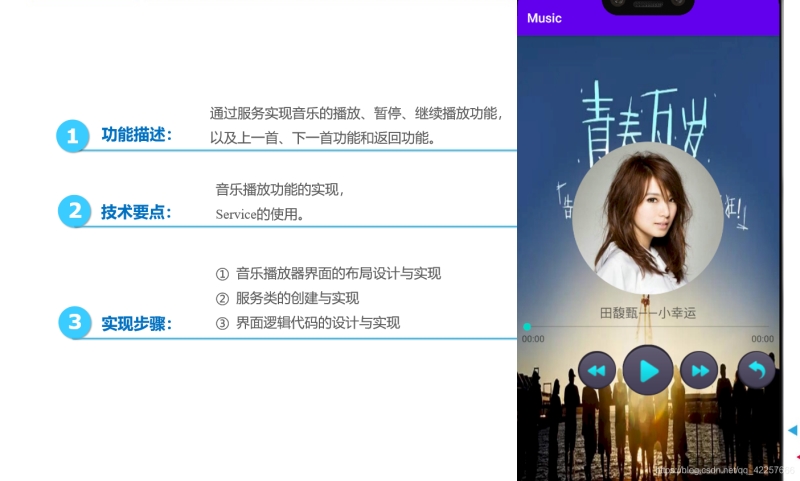 综合运用UI界面设计、数据存储、Activity(活动)、Service(服务)、MusicPlayer(音乐播放类)、ListView(列表)等知识,设计开发一款具有音乐列表的音乐播放器。