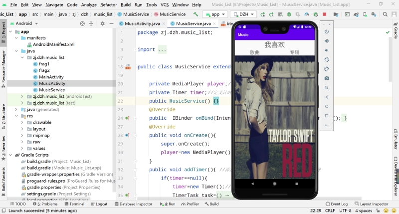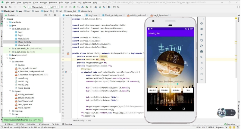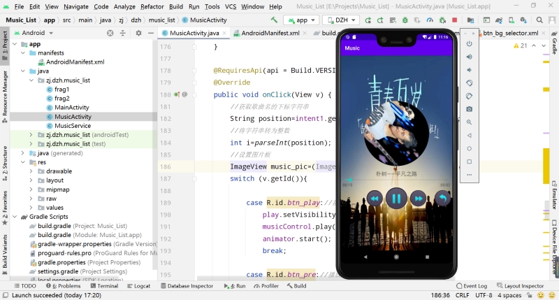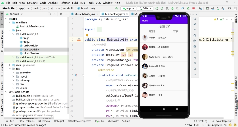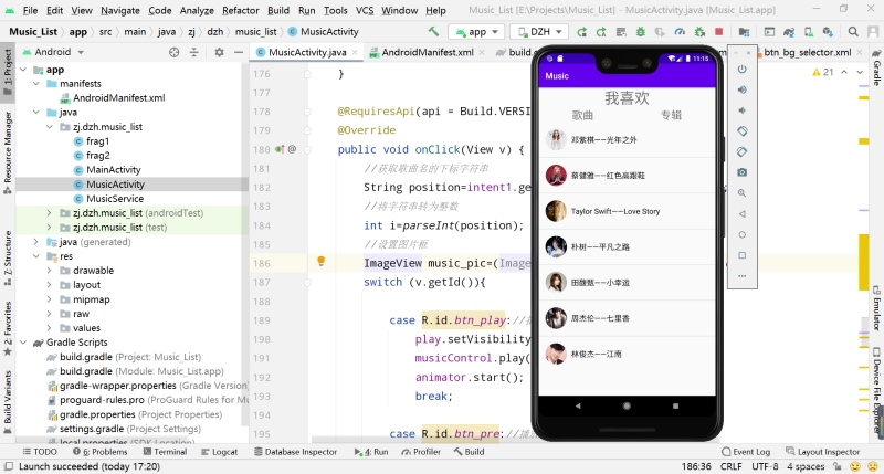1、打开项目,编译成功后运行,会看到Android Studio执行这样的过程:Starting AVD启动模拟器,然后gradle build构建项目,接着就会install安装app,最后launch运行出app。首先显示的是歌曲列表界面: