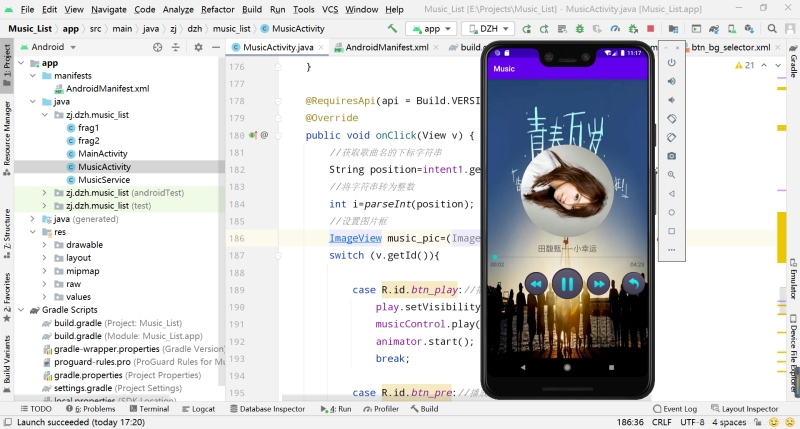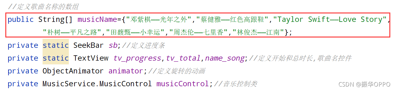 1.4、iv_music就是图片框,显示歌手的图片,name_song是歌曲名的文本框,显示歌曲名称。这里我在MusicActivity里面定义了一个musicName的数组,数组存放的就是歌曲名,和我们在frag1里面定义的name数组内容是一样的。其实这样我们就不需要刚刚的frag1传值给我们歌曲名了。