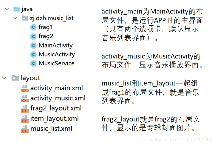 整个项目包含五个java文件和五个layout文件,因为是比较简单的项目,所以没有用工程结构去实现它,这里介绍下它们之间的关系。