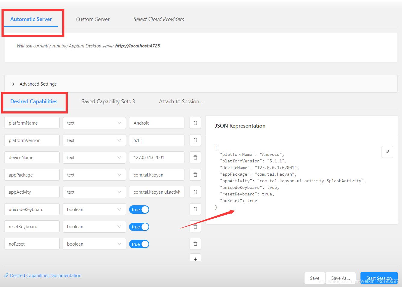 desired_caps={} # 所使用的平台 desired_caps['platformName']='Android' # 所使用的手机的名字 可以通过 adb devices 获得 desired_caps['deviceName']='127.0.0.1:62001' # ANDROID 的版本 desired_caps['platforVersion']='5.1.1' # app 的路径 desired_caps['app']=r'D:\extend\kaoyanbang.apk' # app的包名 desired_caps['appPackage']='com.tal.kaoyan' # app 加载页面 desired_caps['appActivity']='com.tal.kaoyan.ui.activity.SplashActivity' # 设置每次是否清除数据 desired_caps['noReset']='False' # 是否使用unicode键盘输入,在输入中文字符和unicode字符时设置为true desired_caps['unicodeKeyboard']="True" # 是否将键盘重置为初始状态,设置了unicodeKeyboard时,在测试完成后,设置为true,将键盘重置 desired_caps['resetKeyboard']="True" # appium服务器的连接地址 driver=webdriver.Remote('http://localhost:4723/wd/hub',desired_caps) driver.implicitly_wait(2)