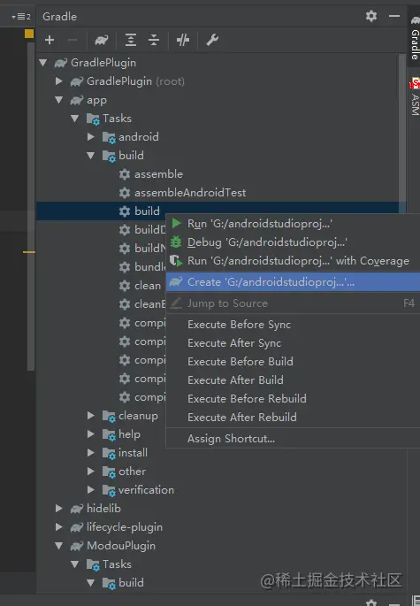 在目标项目(即引入插件的那个项目),打开gradle目录,启动模块一般都是app,所以我们展开到【:app】->【Tasks】右击【build】选择create