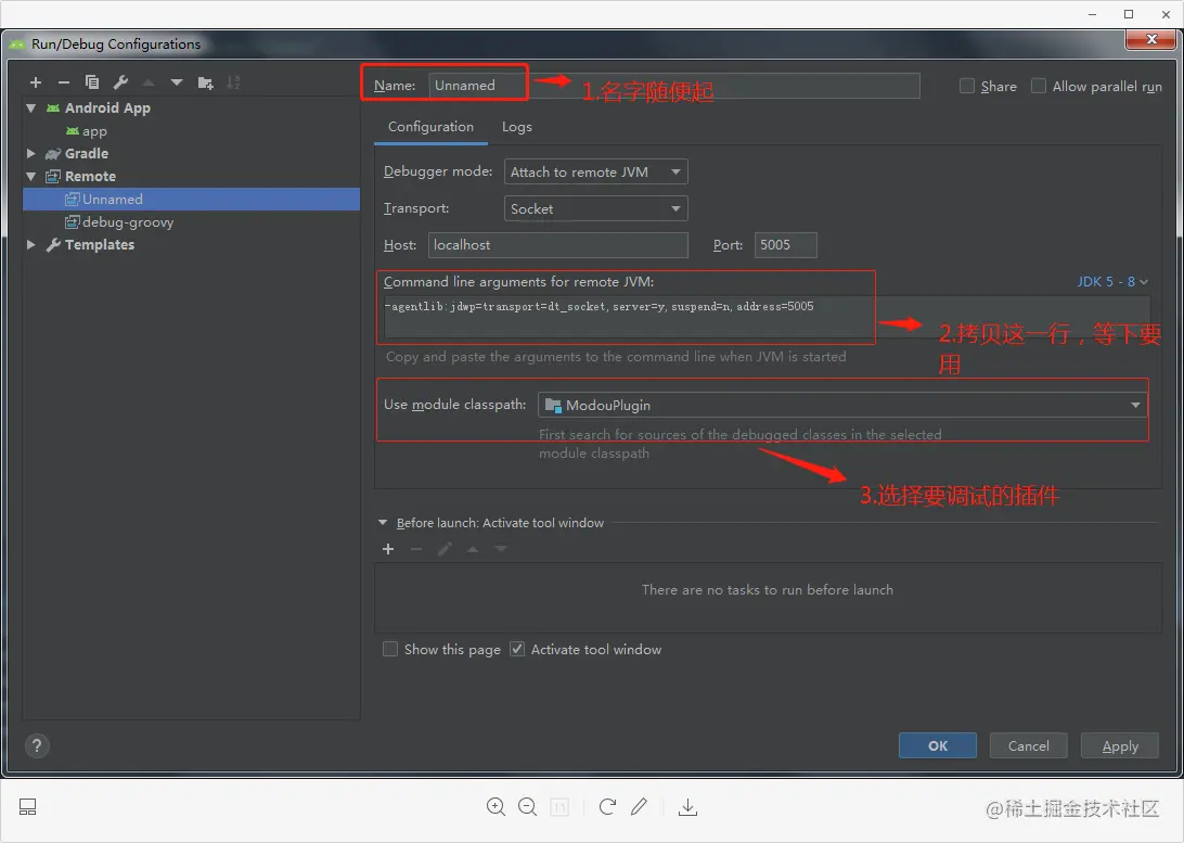 3.名字随便起,把命令行参数复制下来,【Use module classpath】选择要调试的插件,其他默认即可,然后点击【OK】: