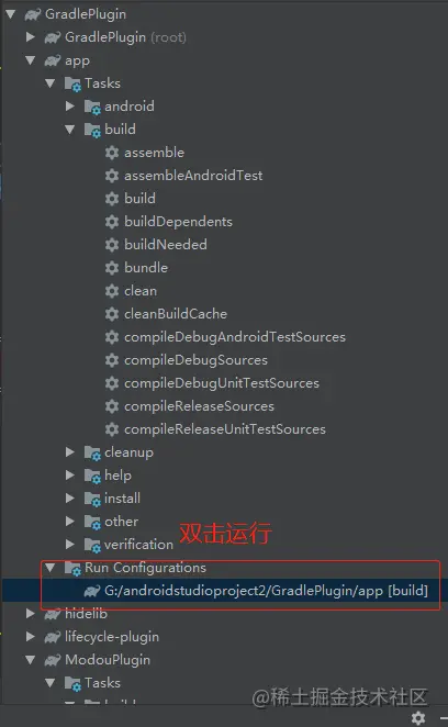7. 现在可以开始调试了,在插件代码里面需要调试的地方打好断点,双击我们新建的gradle任务: