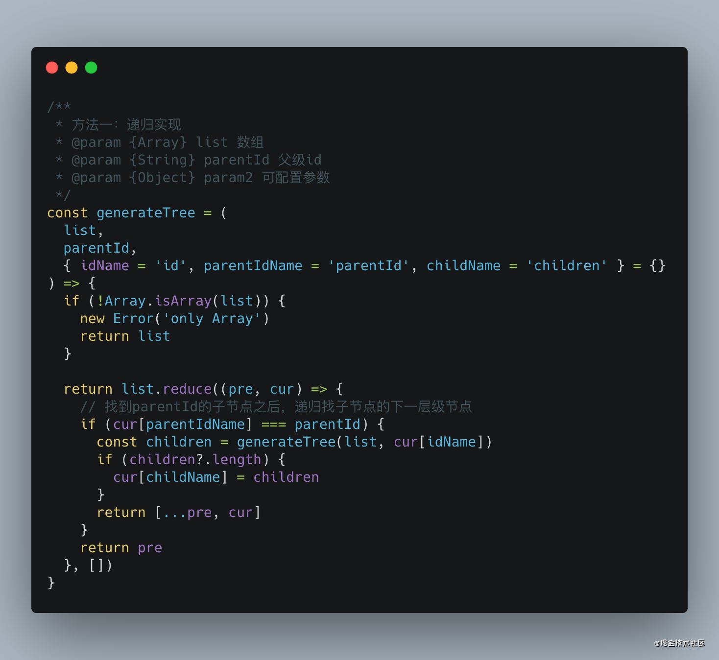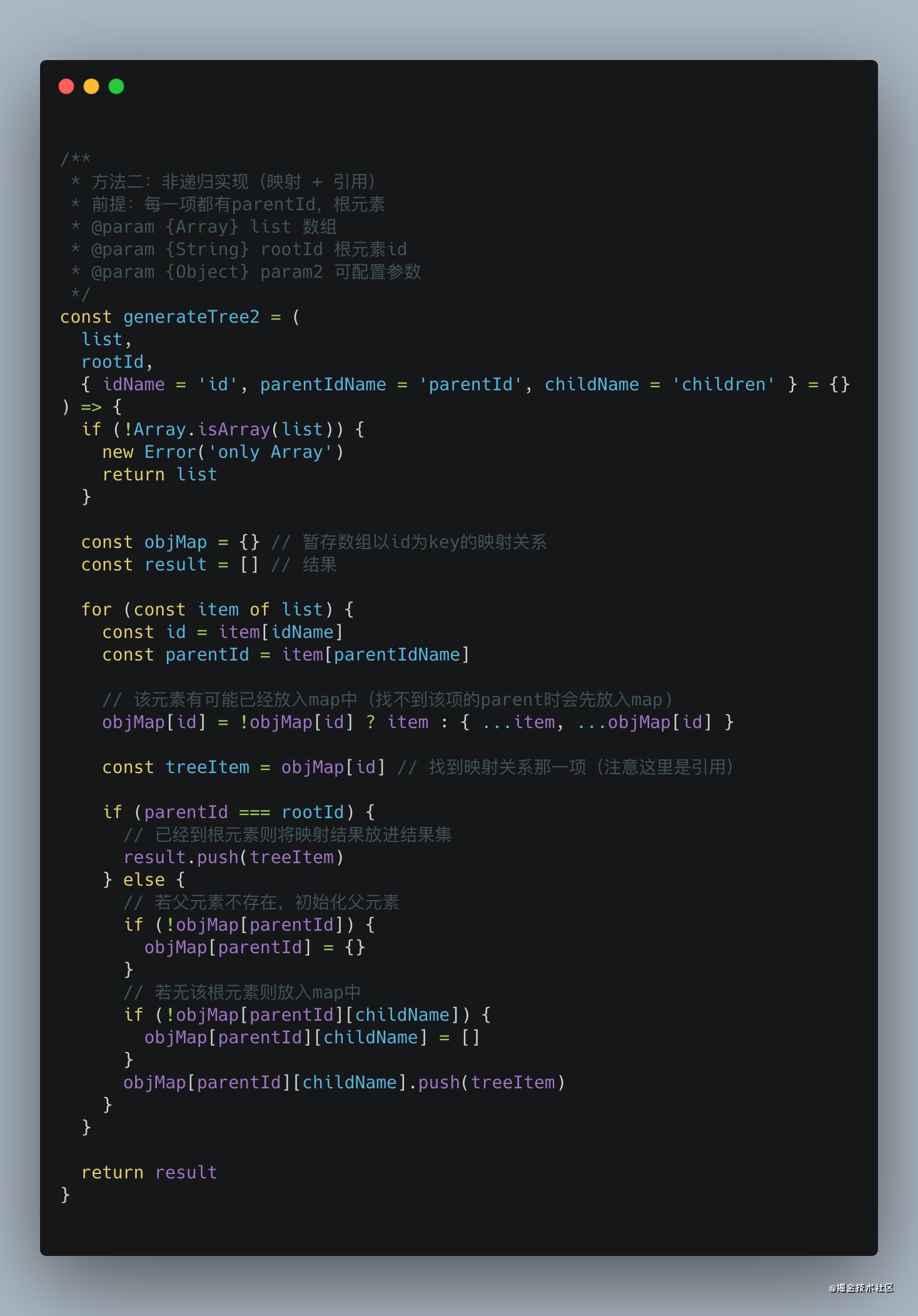 这里巧妙的应用了对象保存的是引用的特点,每次将当前节点的 id 作为 key,保存对应节点的引用信息,遍历数组时,每次更新 objMap 的 children 信息,这样 objMap中保留了所有节点极其子节点,最重要的是,我们只需要遍历一遍数组,时间复杂度为O(n)。使用这种方式,计算时长只需要60ms!
