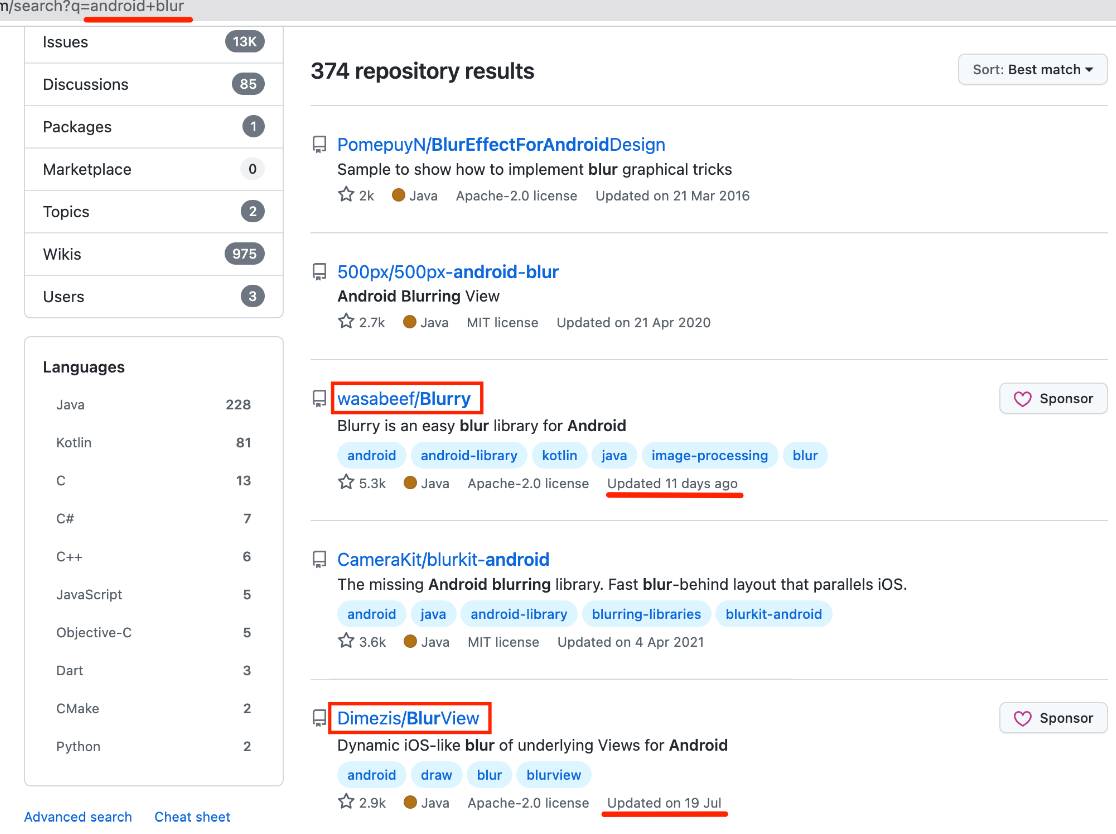 ,可以看到有两个库是比较合适的, Blurry 和 BlurView。 这两个库 Star 数比较高,并且也还在维护着。