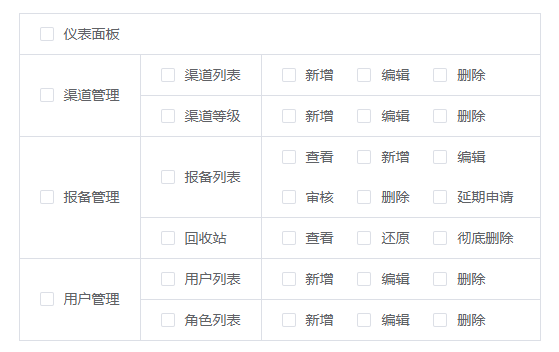 // CSS table { background:#DCDFE6; width: 100%; } table td { background:#FFFFF; } // HTML <table border="0" cellspacing="1" cellpadding="0"> <tr> <td colspan="3"><el-checkbox>仪表面板</el-checkbox></td> </tr> <tr> <td rowspan="2"><el-checkbox>渠道管理</el-checkbox></td> <td><el-checkbox>渠道列表</el-checkbox></td> <td> <el-checkbox>新增</el-checkbox> <el-checkbox>编辑</el-checkbox> <el-checkbox>删除</el-checkbox> </td> </tr> </table>