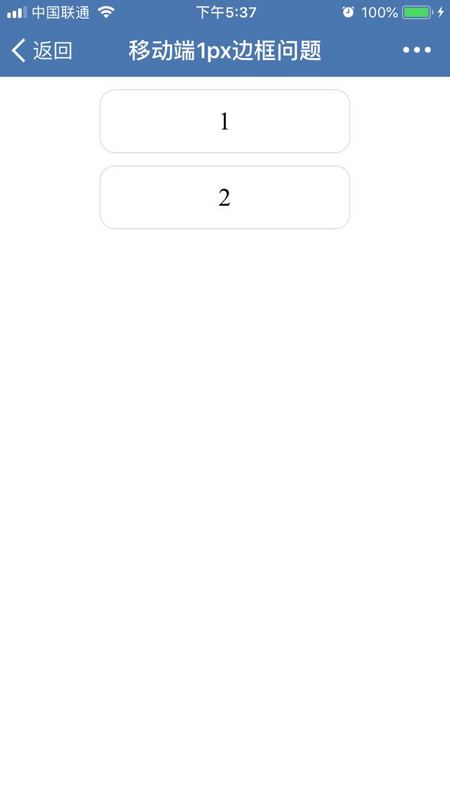 <!DOCTYPE html> <html lang="en"> <head> <meta charset="UTF-8"> <!--<meta name="viewport" content="initial-scale=1, maximum-scale=1, minimum-scale=1, user-scalable=no, width=device-width">--> <title>移动端1px边框问题</title> <script> (function () { var clientWidth = window.screen.width; var dpr = window.devicePixelRatio; var vp = document.createElement('meta'); document.documentElement.style.fontSize = clientWidth > 414 ? '20px' : 20 * dpr * clientWidth / 360 'px'; vp.name = 'viewport'; vp.content = `initial-scale=${1.0 * 1 / dpr}, maximum-scale=${1.0 * 1 / dpr}, minimum-scale=${1.0 * 1 / dpr}, user-scalable=no, width=device-width`; var m = document.getElementsByTagName('meta')[0]; m.parentNode.insertBefore(vp, m); })(); </script> <style> * { margin: 0; padding: 0; } ul, li{ list-style: none; } .lines { width: 10rem; margin: 0 auto; } .lines li { border: 1px solid #cccccc; height: 2.5rem; line-height: 2.5rem; text-align: center; border-radius: 0.6rem; margin-top: 0.5rem; } </style> </head> <body> <ul class="lines"> <li>1</li> <li>2</li> </ul> </body> </html>