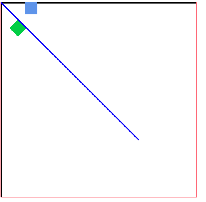 <!DOCTYPE html> <html> <head> <meta charset="UTF-8"> <title></title> <style type="text/css"> canvas{ border:1px solid red; } </style> </head> <body> <canvas id="mycanvas" width="800" height="800"></canvas> </body> <script type="text/javascript"> var canvas = document.getElementById("mycanvas"); var context = canvas.getContext("2d"); //用黑色直线表示平移以后的坐标轴 context.beginPath(); context.moveTo(0,0); context.lineWidth = 10; context.lineTo(800,0); context.stroke(); context.beginPath(); context.moveTo(0,0); context.lineWidth = 10; context.lineTo(0,800); context.stroke(); //原图:蓝色 context.beginPath(); context.fillStyle = "cornflowerblue"; context.fillRect(100,0,50,50); context.fill(); //旋转:绿色 context.beginPath(); context.fillStyle = "limegreen"; context.rotate(Math.PI/4); context.fillRect(100,0,50,50); //用蓝色直线表示平移以后的坐标轴 context.beginPath(); context.moveTo(0,0); context.lineWidth = 5; context.strokeStyle = "blue"; context.lineTo(800,0); context.stroke(); context.beginPath(); context.moveTo(0,0); context.lineWidth = 5; context.strokeStyle = "blue"; context.lineTo(0,800); context.stroke(); </script> </html>
