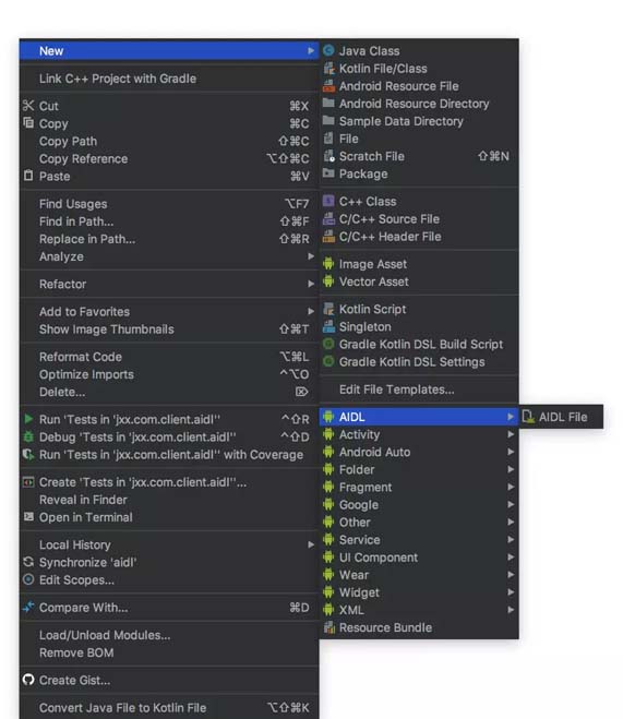 - 首先要将A中定义的aidl文件复制到B中,比如我们在上面定义的IProcessInfo.aidl这个文件,包括路径在内需要原封不动的复制过来。