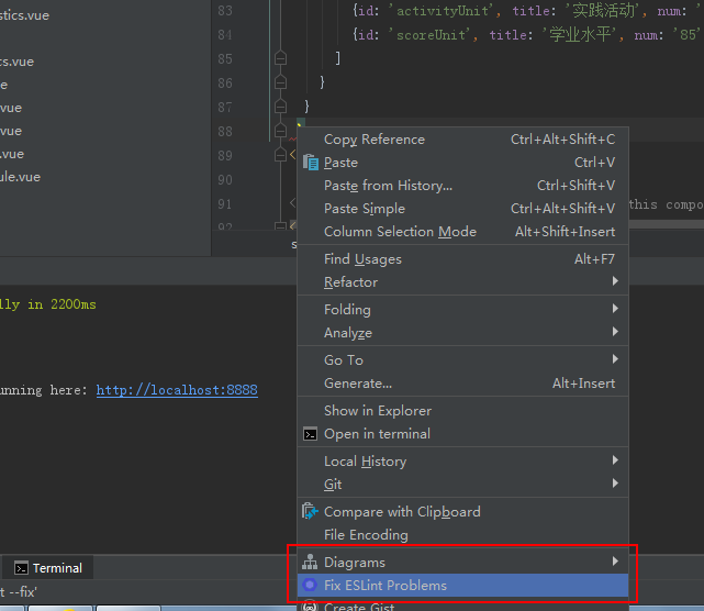 除了此之外,idea和webstorm还能一键格式化,让代码按照ESlint规则自动调整。在有语法错误的文件右击,然后点击Fix ESint就好了: