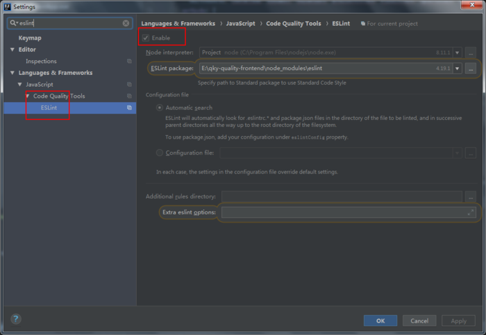 Setting ->Preferences -> Languages & Frameworks -> JavaScript -> Code Quality Tools -> Eslint ,然后勾选Enable单选框。