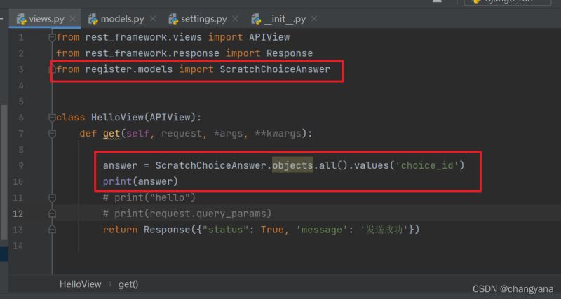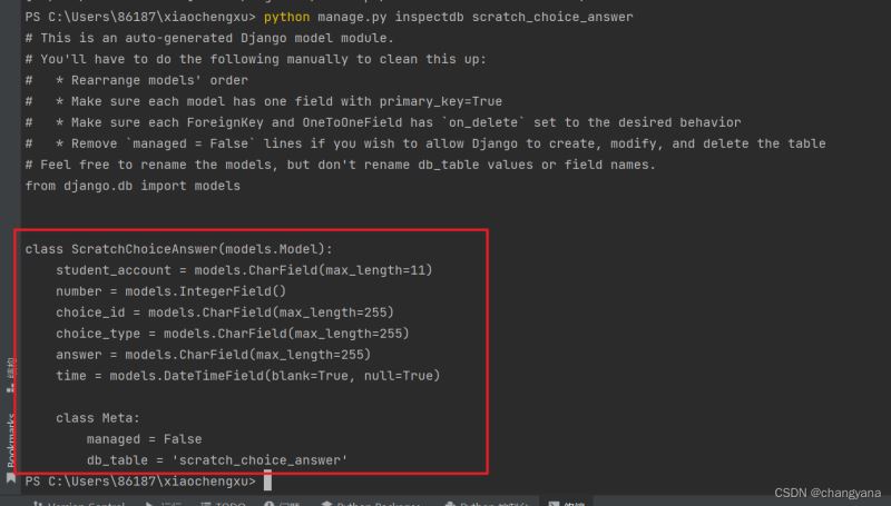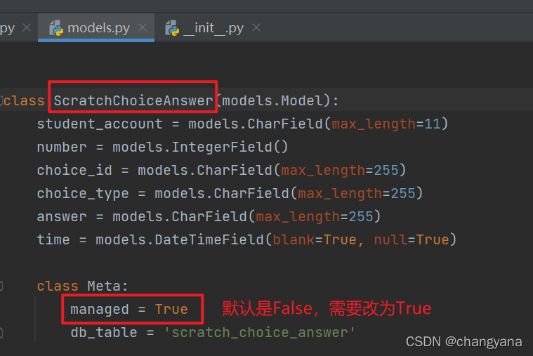 之后把想要使用的表的 managed 都改成 True。比如我想要在django中操作scratch_choice_answer表里的信息,则需要通过类名找到该表,然后修改如图: