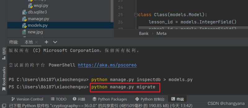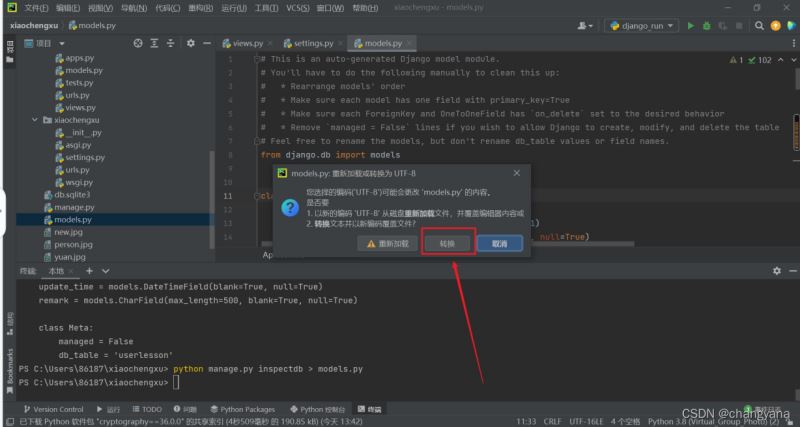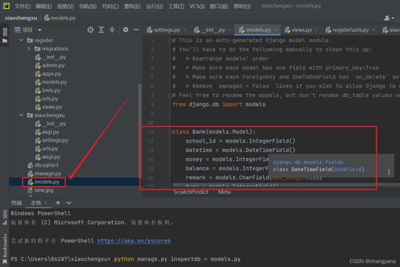 等几秒或者刷新一下文件夹,就能在 manage.py 的下面出现一个 models.py,里面包含了已有数据库的所有表及结构。