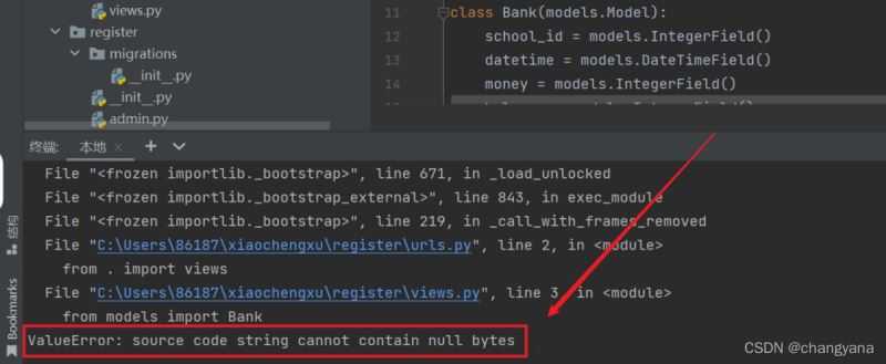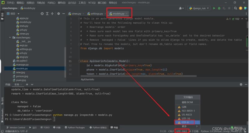 然后运行django,(如果这时候报错ValueError: source code string cannot contain null bytes,其实是models里的编码问题,解决方法: