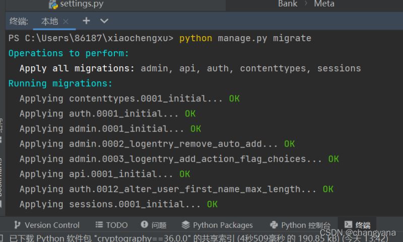 然后运行如下指令,该指令就是将django与数据库进行同步,可以进行增删改查操作。