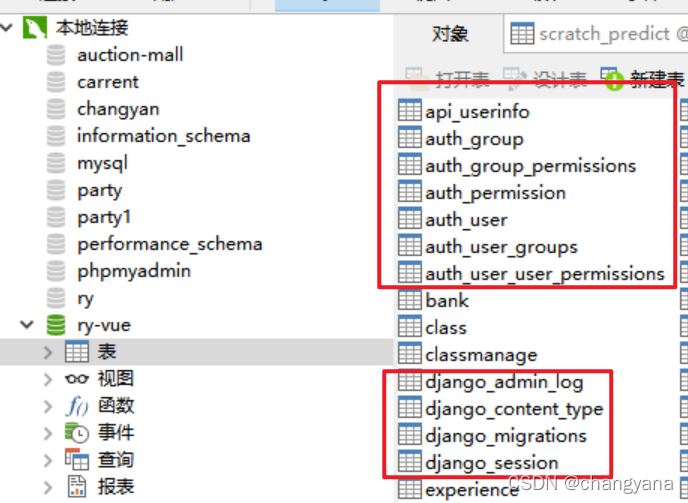 (这时候刷新一下Mysql,会发现自动生成了auth_xxx和django_xxx的表,这个是django用来记录对数据库的一些操作的,就放那儿不用管,对整个项目的运行没有影响)