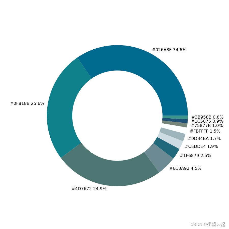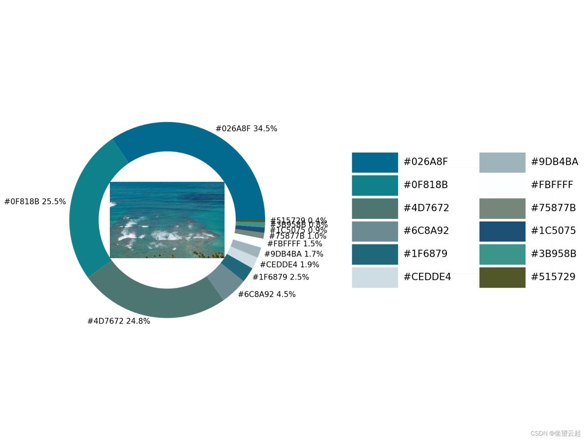 在下面的代码中,我将公差值设置为 12,并将颜色代码输出的数量限制为 11 种颜色(limit=12)。 可以根据需要更改数字。 获得的结果将是 RGB 颜色代码及其出现。