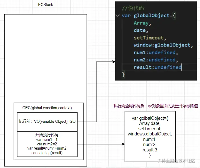 开始执行代码前,会创建一个执行上下文栈ESC,开始执行全局代码,所以会创建一个全局执行上下文栈GEC,将GEC压入栈底,全局执行上下文包括两部分: