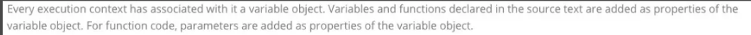 这里借助coderwhy的翻译:每个执行上下文都关联一个变量对象(Vriable Object),在源代码中变量和函数的声明会被作为属性加入到变量对象中,对于函数来说,参数也会被加入到VO中但是ECMA5以后的版本,官网做了一些词汇用语的修改