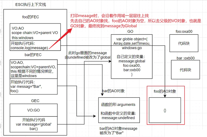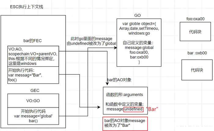 开始执行bar函数里面的代码,var message="Bar",会将bar的AO对象的message变量值从undefined改为"Bar",接下来在执行foo()函数,注意:此时bar函数还没弹出栈,因为foo函数还在执行