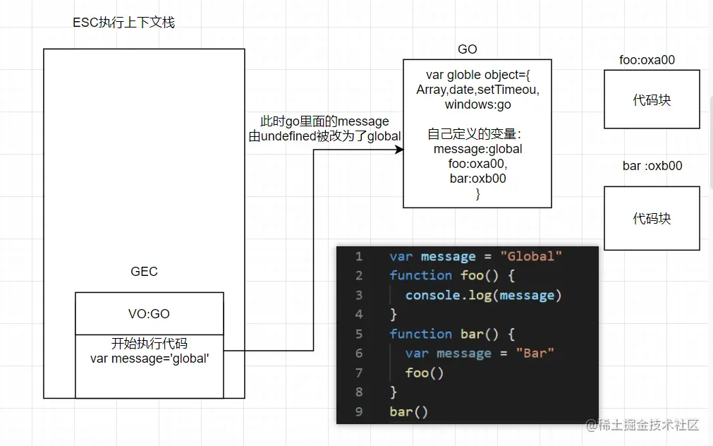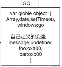 首先初始化全局对象GO,里面有Array、date、setTime等等,还有自己定义的 message对象初始值为undefined,foo和bar函数对象