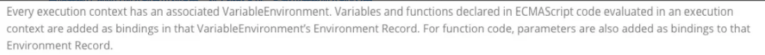 每个执行上下文都会关联一个变量环境(variable Environment),在执行代码中变量和函数的声明会被当做环境记录(Environment Record)加入到变量环境中。