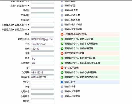 <table border="0px" style="font-size:12px"> <tr> <td colpan="3"><input type="submit" name="button" id="button" value="提交" /></td> </tr> <tr> <td align="right">身份证(正则表达式库):</td> <td><input name="sfz" type="text" id="sfz" /></td> <td><div id="sfzTip" style="width:300px"></div></td> <!--必须注意这里提示验证信息中的div的id值,跟要验证控件中的id值多了一个Tip,下面的都是这样。必须多的是Tip,也必须要多。--> </tr> <tr> <td align="right">身份证(外部函数):</td> <td><input type="text" id="sfz1" style="width:120px" /></td> <td><div id="sfz1Tip" style="width:300px"></div></td> </tr> <tr> <td align="right">整数:</td> <td><input type="text" id="zs" style="width:120px" /></td> <td><div id="zsTip" style="width:300px"></div></td> </tr> <tr> <td align="right">正整数:</td> <td><input type="text" id="zzs" style="width:120px" /></td> <td><div id="zzsTip" style="width:300px"></div></td> </tr> <tr> <td align="right">负整数:</td> <td><input type="text" id="fzs" style="width:120px" /></td> <td><div id="fzsTip" style="width:300px"></div></td> </tr> <tr> <td align="right">数字:</td> <td><input type="text" id="sz" style="width:120px" /></td> <td><div id="szTip" style="width:300px"></div></td> </tr> <tr> <td align="right">正数(正整数 0):</td> <td><input type="text" id="zs1" style="width:120px" /></td> <td><div id="zs1Tip" style="width:300px"></div></td> </tr> <tr> <td align="right">负数(负整数 0):</td> <td><input type="text" id="fs" style="width:120px" /></td> <td><div id="fsTip" style="width:300px"></div></td> </tr> <tr> <td align="right">浮点数:</td> <td><input type="text" id="fds" style="width:120px" /></td> <td><div id="fdsTip" style="width:300px"></div></td> </tr> <tr> <td align="right">正浮点数:</td> <td><input type="text" id="zfds" style="width:120px" /></td> <td><div id="zfdsTip" style="width:300px"></div></td> </tr> <tr> <td align="right">负浮点数:</td> <td><input type="text" id="ffds" style="width:120px" /></td> <td><div id="ffdsTip" style="width:300px"></div></td> </tr> <tr> <td align="right">非负浮点数(正浮点数 0):</td> <td><input type="text" id="fffds" style="width:120px" /></td> <td><div id="fffdsTip" style="width:300px"></div></td> </tr> <tr> <td align="right">非正浮点数(负浮点数 0):</td> <td><input type="text" id="fzfds" style="width:120px" /></td> <td><div id="fzfdsTip" style="width:300px"></div></td> </tr> <tr> <td align="right">颜色:</td> <td><input type="text" id="ys" style="width:120px" /></td> <td><div id="ysTip" style="width:300px"></div></td> </tr> <tr> <td align="right">你的EMAIL:</td> <td><input type="text" id="email" style="width:120px" /></td> <td><div id="emailTip" style="width:300px"></div></td> </tr> <tr> <td align="right">手机:</td> <td><input type="text" id="sj" style="width:120px" /></td> <td><div id="sjTip" style="width:300px"></div></td> </tr> <tr> <td align="right">邮编:</td> <td><input type="text" id="yb" style="width:120px" /></td> <td><div id="ybTip" style="width:300px"></div></td> </tr> <tr> <td align="right">非空:</td> <td><input type="text" id="fk" style="width:120px" /></td> <td><div id="fkTip" style="width:300px"></div></td> </tr> <tr> <td align="right">图片:</td> <td><input type="text" id="tp" style="width:120px" /></td> <td><div id="tpTip" style="width:300px"></div></td> </tr> <tr> <td align="right">压缩文件:</td> <td><input type="text" id="rar" style="width:120px" /></td> <td><div id="rarTip" style="width:300px"></div></td> </tr> <tr> <td align="right">ip4:</td> <td><input type="text" id="ip4" style="width:120px" /></td> <td><div id="ip4Tip" style="width:300px"></div></td> </tr> <tr> <td align="right">QQ号码:</td> <td><input type="text" id="qq" style="width:120px" /></td> <td><div id="qqTip" style="width:300px"></div></td> </tr> <tr> <td align="right">国内电话:</td> <td><input type="text" id="dh" style="width:120px" /></td> <td><div id="dhTip" style="width:300px"></div></td> </tr> <tr> <td align="right">用户名:</td> <td><input type="text" id="yhm" style="width:120px" /></td> <td><div id="yhmTip" style="width:300px"></div></td> </tr> <tr> <td align="right">字母:</td> <td><input type="text" id="zm" style="width:120px" /></td> <td><div id="zmTip" style="width:300px"></div></td> </tr> <tr> <td align="right">大写字母:</td> <td><input type="text" id="dxzm" style="width:120px" /></td> <td><div id="dxzmTip" style="width:300px"></div></td> </tr> <tr> <td align="right">小写字母:</td> <td><input type="text" id="xxzm" style="width:120px" /></td> <td><div id="xxzmTip" style="width:300px"></div></td> </tr> <tr> <td align="right">身份证:</td> <td><input type="text" id="sfz" style="width:120px" /></td> <td><div id="sfzTip" style="width:300px"></div></td> </tr> </table>