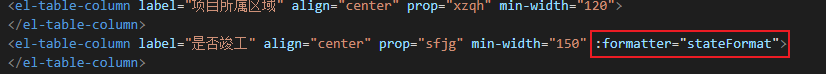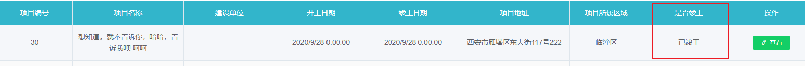 <el-table v-loading="loading.table" :data="data.list.items" fit stripe highlight-current-row :cell-style="cellStyle" element-loading-text="玩命加载中" element-loading-spinner="el-icon-loading" :header-cell-class-name="headerStyle" style="width:100%" @selection-change="handleSelectionChange" border :row-class-name="tableRowClassName"> <el-table-column label="项目编号" align="center" prop="id" min-width="120"> </el-table-column> <el-table-column label="项目名称" align="center" prop="xmmc" min-width="180"> </el-table-column> <el-table-column label="建设单位" align="center" prop="jsdwmc" min-width="150"> </el-table-column> <el-table-column label="开工日期" align="center" prop="jhkgrq" min-width="150"> </el-table-column> <el-table-column label="竣工日期" align="center" prop="jhjgrq" min-width="150"> </el-table-column> <el-table-column label="项目地址" align="center" prop="xmwz" min-width="180"> </el-table-column> <el-table-column label="项目所属区域" align="center" prop="xzqh" min-width="120"> </el-table-column> <el-table-column label="是否竣工" align="center" prop="sfjg" min-width="150" :formatter="stateFormat"> </el-table-column> <el-table-column label="操作" align="center" min-width="120"> <template slot-scope="scope"> <el-button icon="el-icon-edit" size="mini" type="success" @click="lookHandler(scope.$index, scope.row)">查看 </el-button> </template> </el-table-column> </el-table>