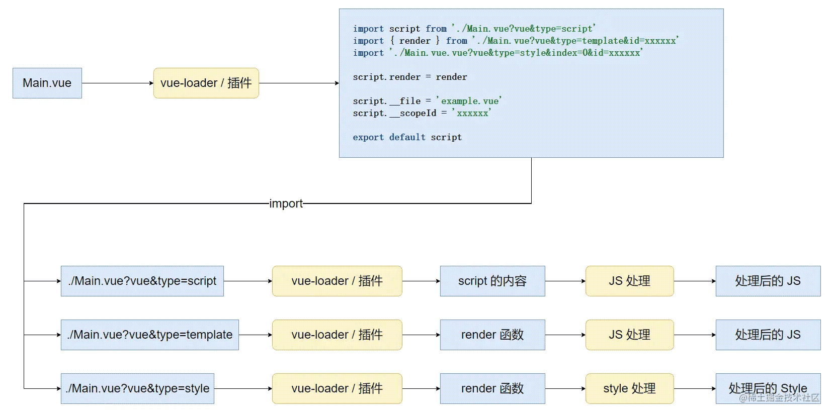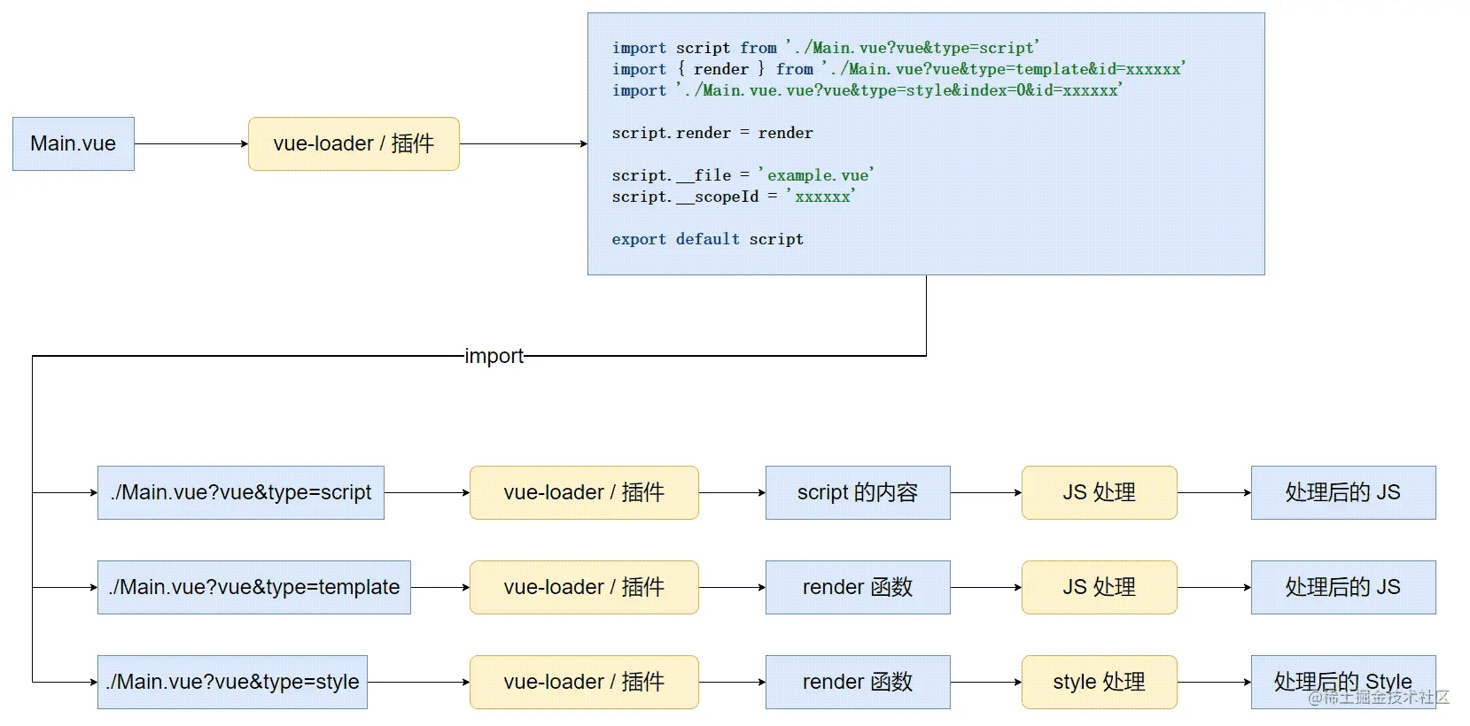 但我们可以用一个巧妙的办法去解决这个问题:使用一个临时模块,去分别引入 script、template、style,并将其组合,伪代码如下:
