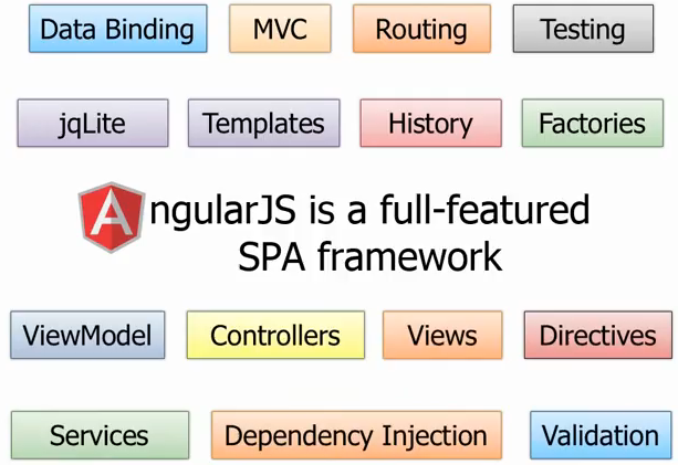 从上图可以发现,AngularJs几乎支持构建一个Web应用的所有内容——数据绑定、表单验证、路由、依赖注入、控制器、模板和视图等。
