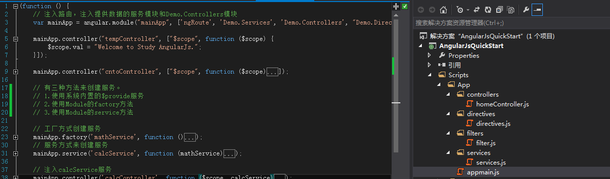 也可以使用AngularJs内置的模块化来更好地组织代码结构。具体的代码请到本文结尾进行下载。这里给出一张采用模块化开发的截图: