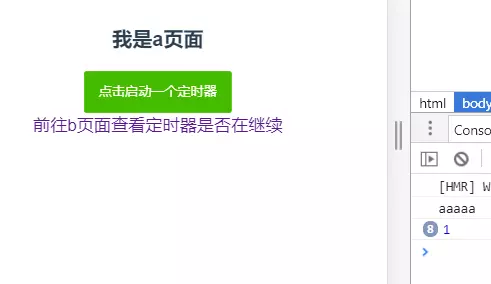 我在a页面写一个定时,让他每秒钟打印一个1,然后跳转到b页面,此时可以看到,定时器依然在执行。这样是非常消耗性能的。