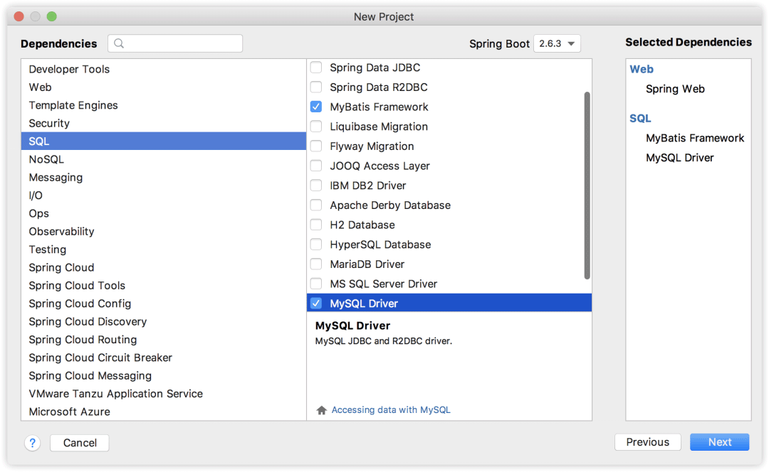 选一下 MyBatis 和 MySQL 驱动,做一个简单的测试案例。